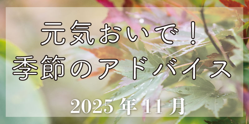 2025年11月13日 / 最終更新日時 : 2025年11月13日 hasegawa 元気おいで!季節のアドバイス 元気おいで!季節のアドバイス2025年11月 やっと紅葉の秋になりました。 秋は肺経の季節です。邪気は燥邪です。皮膚、鼻、腸など体の粘膜を乾燥させない事が大事です。 腸の粘膜の為には油分が必要です。夏におひたしで食べていた野菜を軽く油分でいためるなど工夫が必要です。 […]
