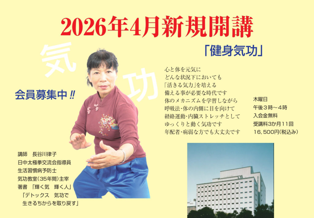 2026年2月22日 / 最終更新日時 : 2026年2月22日 hasegawa 4月開講の気功教室のおしらせ 健康を東洋医学を含め、いろんな角度からアプローチして練功します。呼吸運動、経絡ストレッチなどゆっくりとした動きで心と体を元気にします。年配者、お体の弱い方も大丈夫です。一緒に元気になりましょう。 詳細は下記チラシをご覧く […]